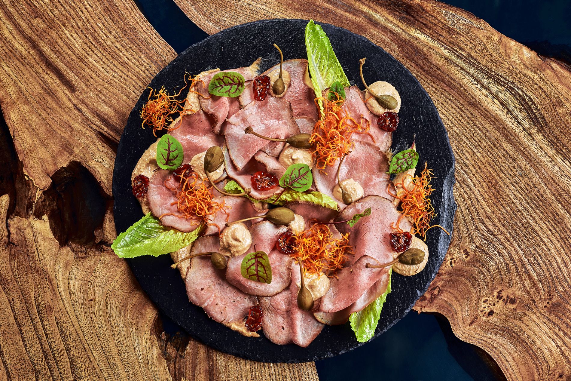 - Na krátké nudličky nakrájej telecí studenou pečeni, kousek dušeného roastbeefu nebo studený beefsteak, kousek šunky, pak vařeného uzeného jazyka, jednoho očištěného slanečka, 4 sardele, 1 oloupané jablko, 1 kyselou okurku, přidej 2 lžíce vařených bílých fazolí, lžíci kaparů a 2 natvrdo uvařená a hrubě rozsekaná vejce.