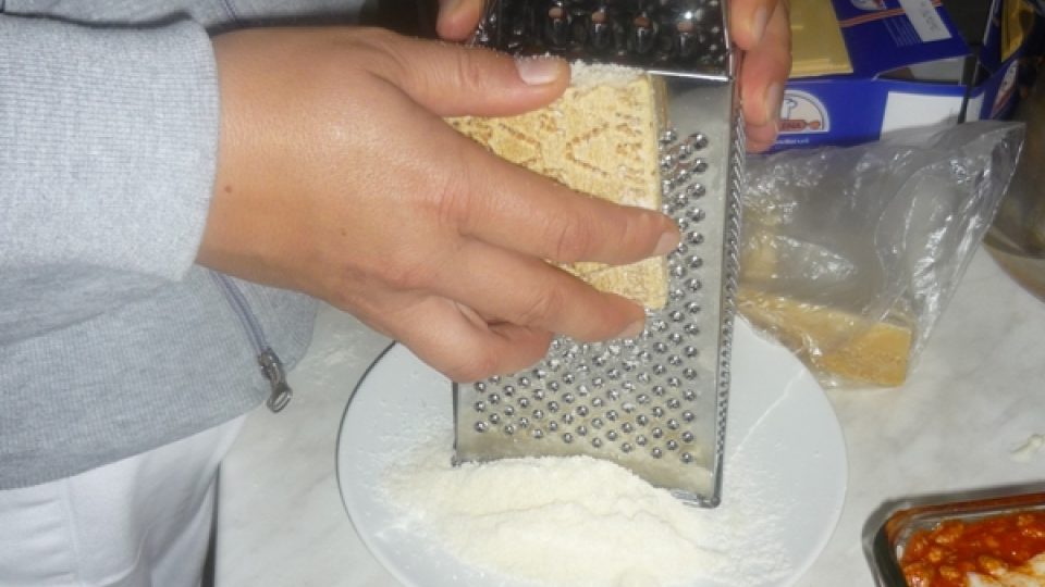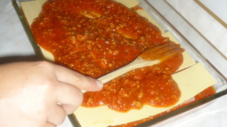 Na oleji lehce do sklovata opražíme nadrobno nakrájenou oloupanou cibuli, poté přidáme mleté maso a vydusíme z něj vodu. Až je maso opražené a bez zbytečné vody, zalijeme jej 1 dcl červeného vína a opět vydusíme přebytečné tekutiny. Loupaná konzervovaná rajčata pomačkáme a přidáme k masu, osolíme a opepříme podle chuti a necháme a necháme v otevřeném hrnci dusit na co nejmírnějším žáru asi 2 hodiny. Paní Míša doporučuje použít hrnec s teflonovým dnem, na který se masová směn v průběhu dušení nepřichytává. Pro jistotu doporučuje (zvláště ke konci tepelné úpravy, kdy směs už obsahuje málo vody) omáčku občas promíchat. Směs nepoužíváme úplně vřelou, necháme ji mírně zchladnout. Čas využijeme k přípravě bešamelu.