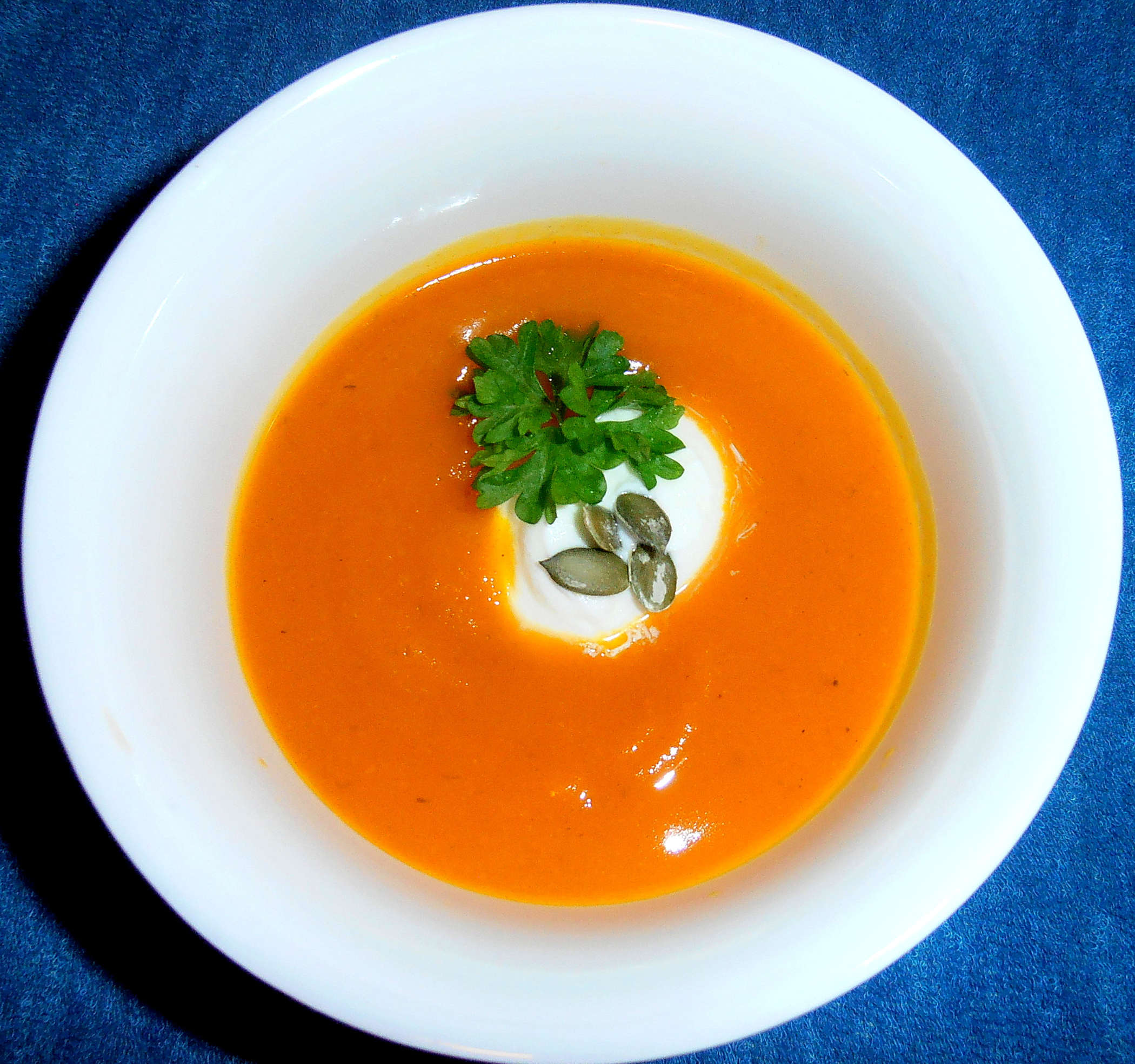 Servírujeme v misce s kopečkem kysané smetany posypané semínky dýně, slunečnice a podobně. Pro změnu lze přidat kostičky opečeného chleba. Semínka z dýně si usušíme a sníme, nebo zasadíme.