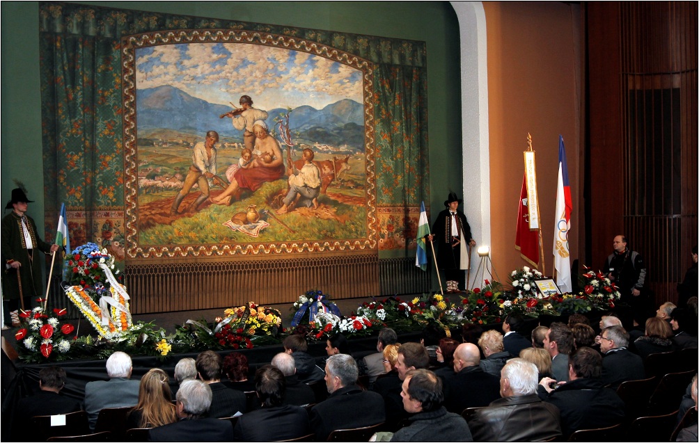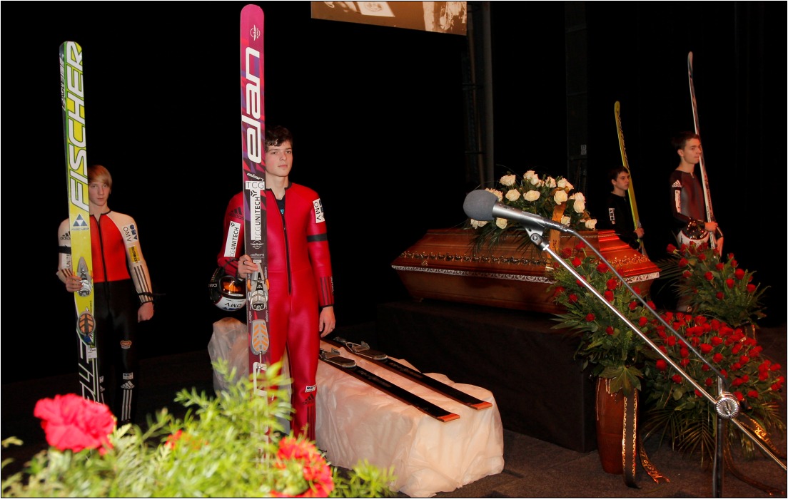 U rakve drželi čestnou stráž členové skokanské party Remsa boys a poté také mladí skokani z frenštátského skokanského oddílu. Po stranách pódia stáli s vlajkami dva krojovaní Valaši, členové Sportovního klubu Valašského království.