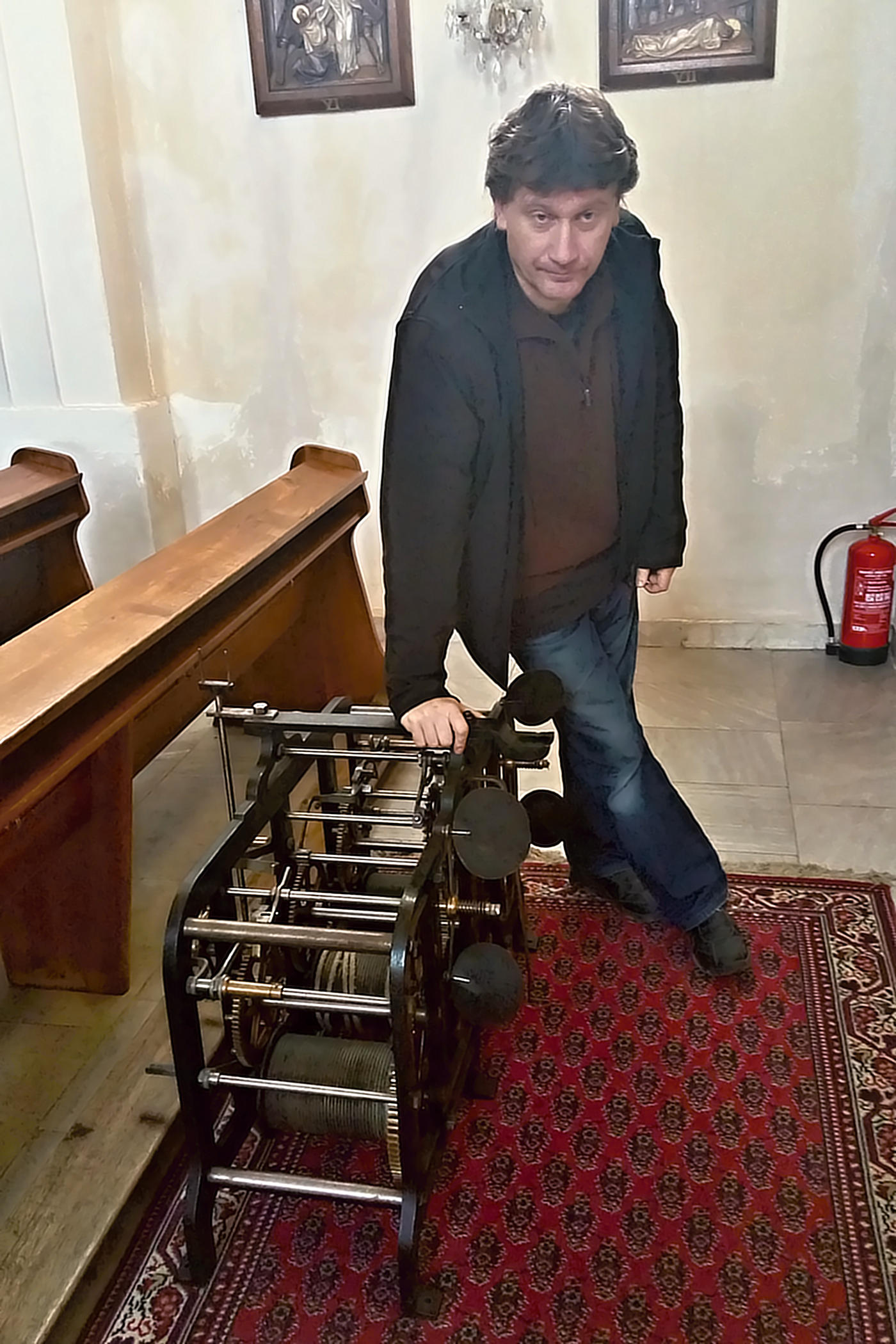 „Stroj je stále funkční. Farníci ho při rekonstrukci kostela zrenovovali, namazali a teď tady zůstává jako perlička historie, protože málokdo už ví, jak vypadaly původní věžní hodiny. Dnes máme na věži elektronické – malou krabičku, která je poháněna signálem z Frankfurtu. Ty staré se musely každý týden natahovat,“ vzpomíná farář.