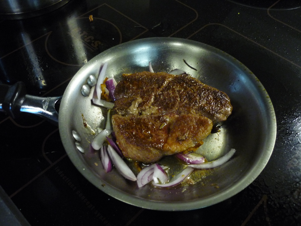 Maso protkneme slaninou, osolíme, opepříme a převážeme provázkem, aby drželo tvar. V nádobě rozpálíme sádlo, zbylou slaninu nakrájenou na kostičky a maso ze všech stran v tuku opečeme. Poté maso vyjmeme a potřeme ho prolisovaným česnekem. Do výpeku přidáme nadrobno nakrájenou cibuli, vložíme zpět maso, podlijeme vínem a dusíme téměř doměkka. Posledních 20 minut dopékáme v troubě, čímž docílíme zlatavého zabarvení. Z měkkého masa odstraníme provázek a nakrájíme ho na porce.