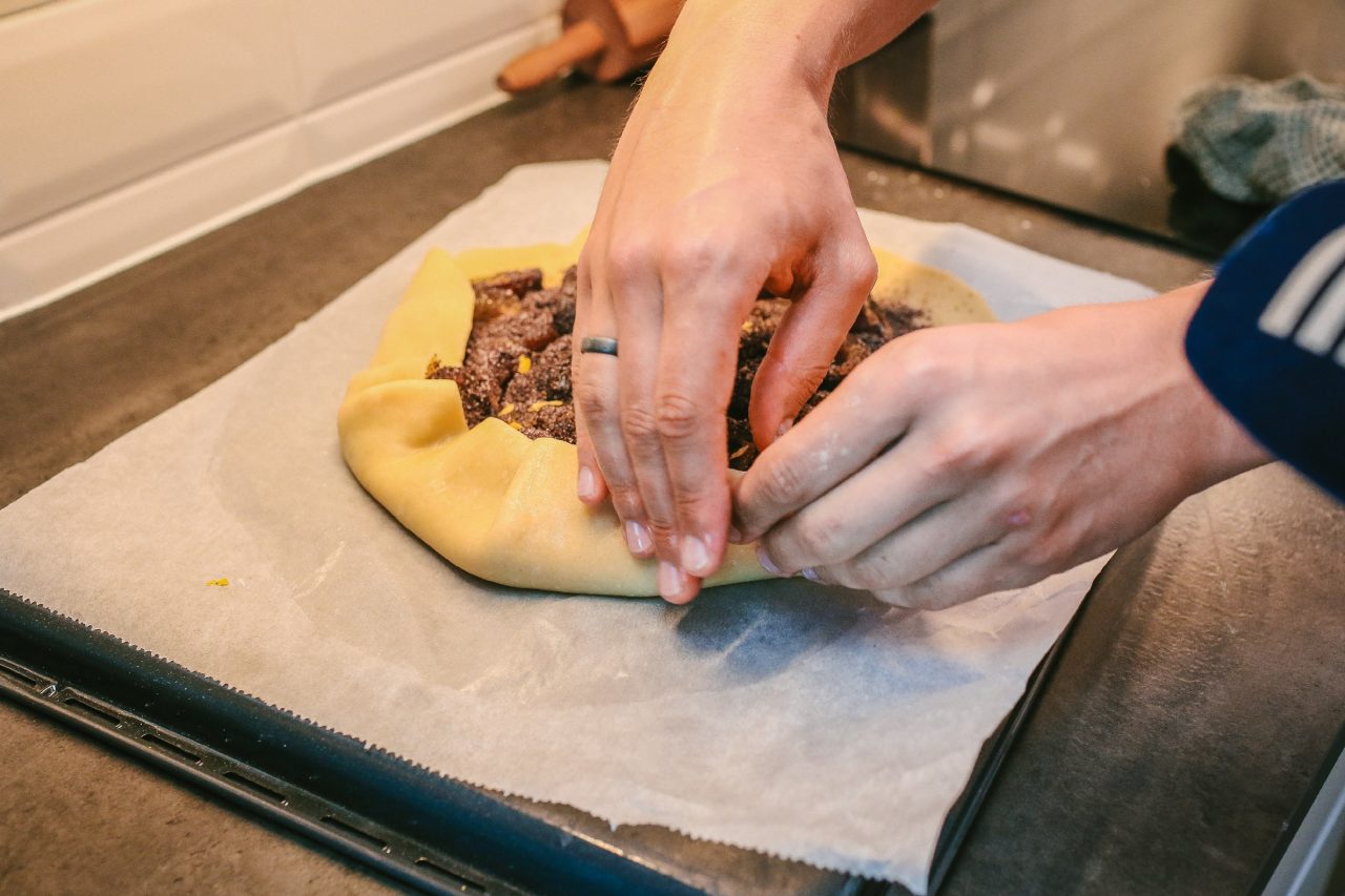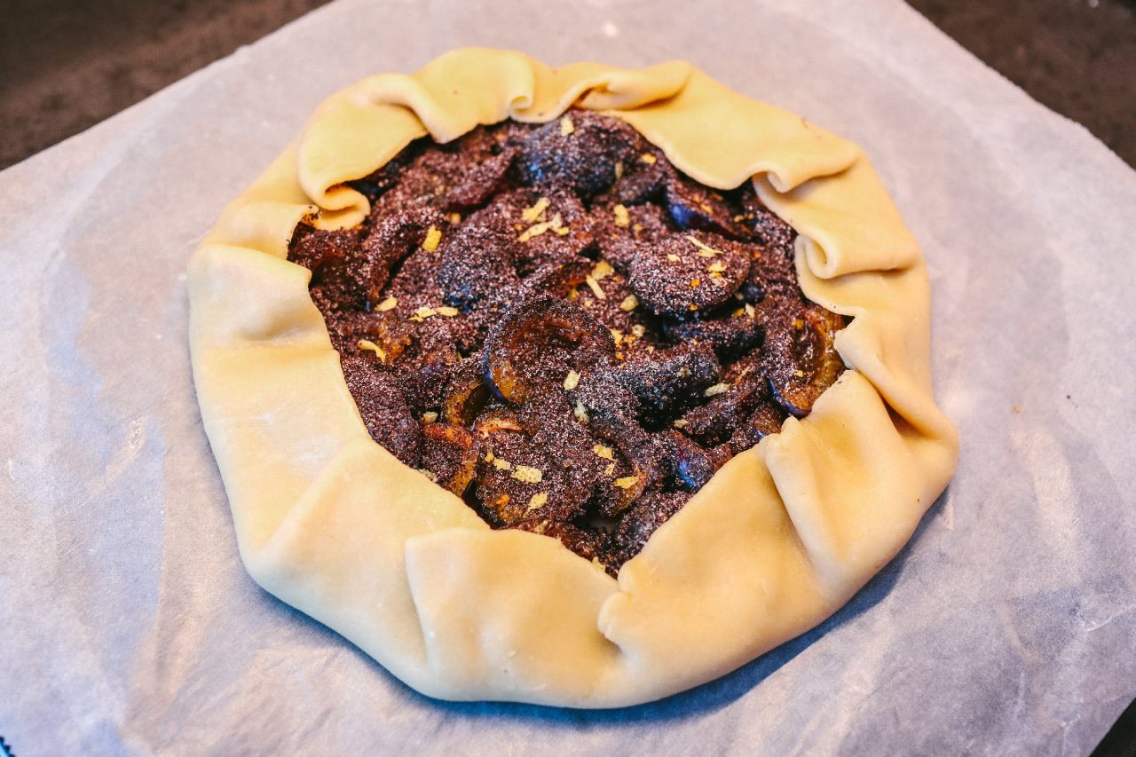 Na náplň si připravíme vypeckované půlené švestky, které vrstvíme neorganizovaně od středu, odkud je rozprostřeme do stran tak, aby nám zůstal okraj široký cca 4–5 cm, abychom ho zvládli ohrnout.