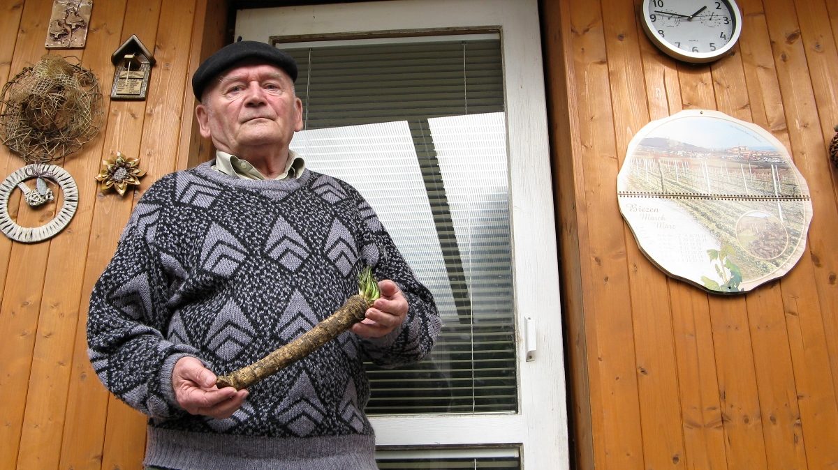 „Škrábat, ne loupat,“ říká Emil Kubálek, když balí předposlední ze svých loni vypěstovaných křenů. Kdyby se vám křen zdál příliš silný, můžete si ho zjemnit jablkem. Kubálkovi patří k posledním, kteří si pro svou potřebu pěstují legendární místní křen.