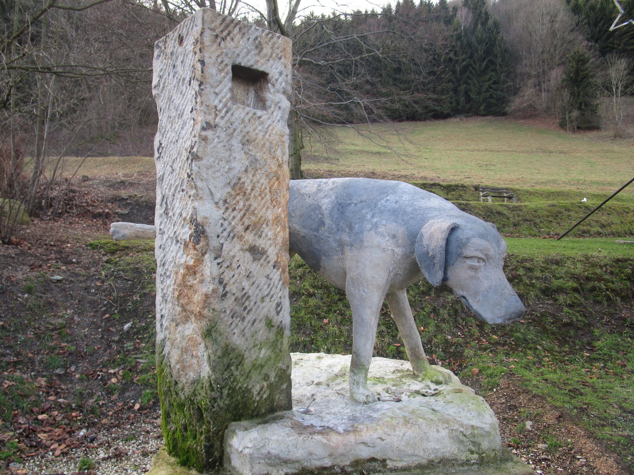 Jde o sochu pejska, který má zvednutou pravou zadní nohu a čůrá na patník. Kašna se nachází jen pár kroků od místního orloje, který stojí v centru obce.