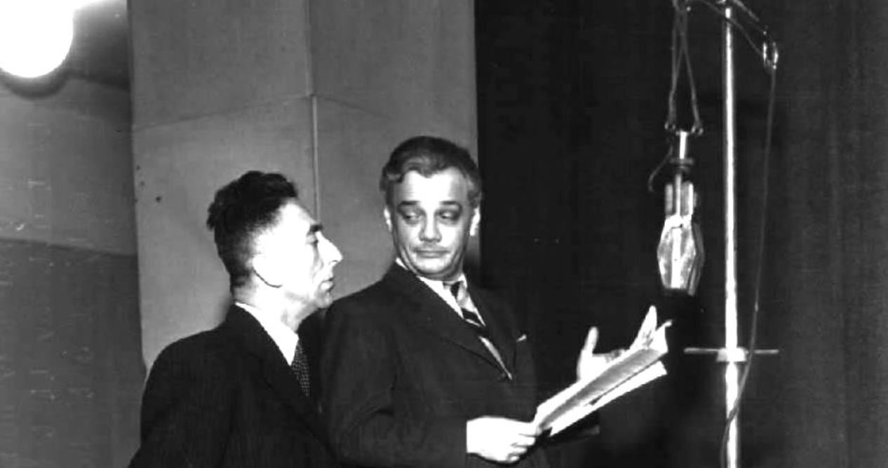 Jindřich Plachta a Jindřich Láznička - natáčení kabaretu Na vlně dobré nálady - 1941. Foto: Archivní a programové fondy Českého rozhlasu